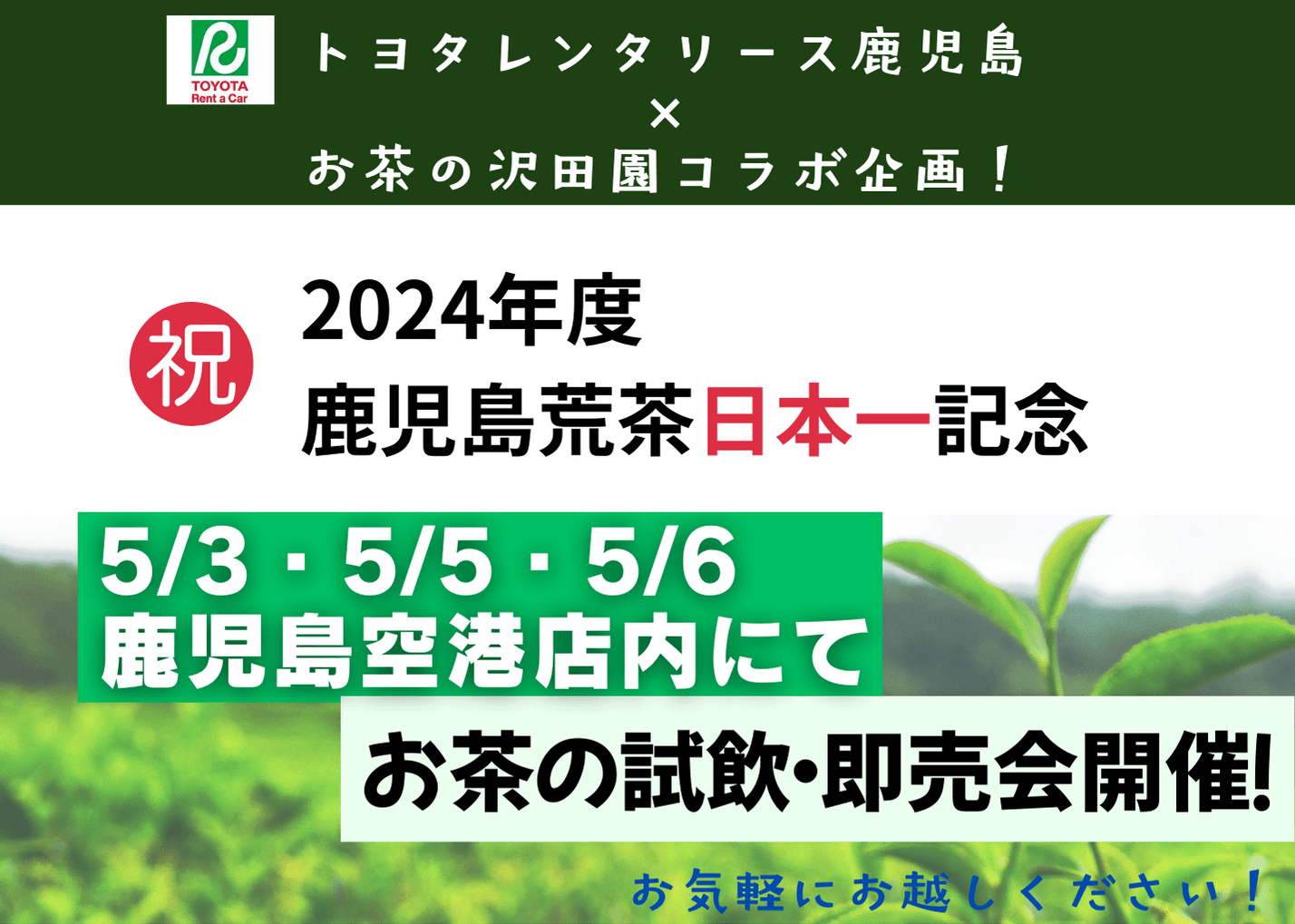 【鹿児島空港店よりお知らせ】 鹿児島県荒茶生産量全国1位を記念して 鹿児島茶の無料試飲会即売会を実施いたします。 5/3(土)・5/5(月)・5/6(火) (9:00〜16:30) お気軽にご利用ください。